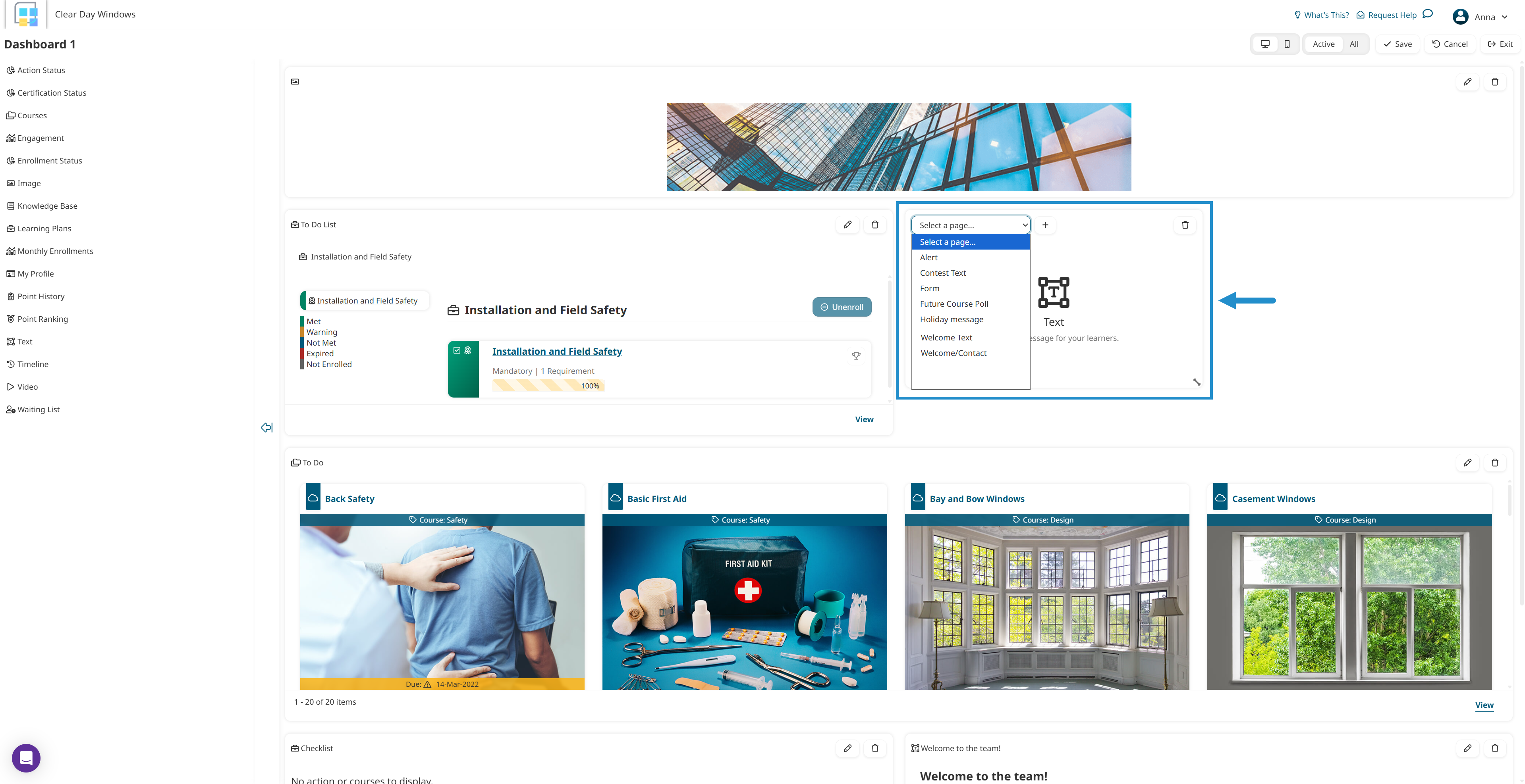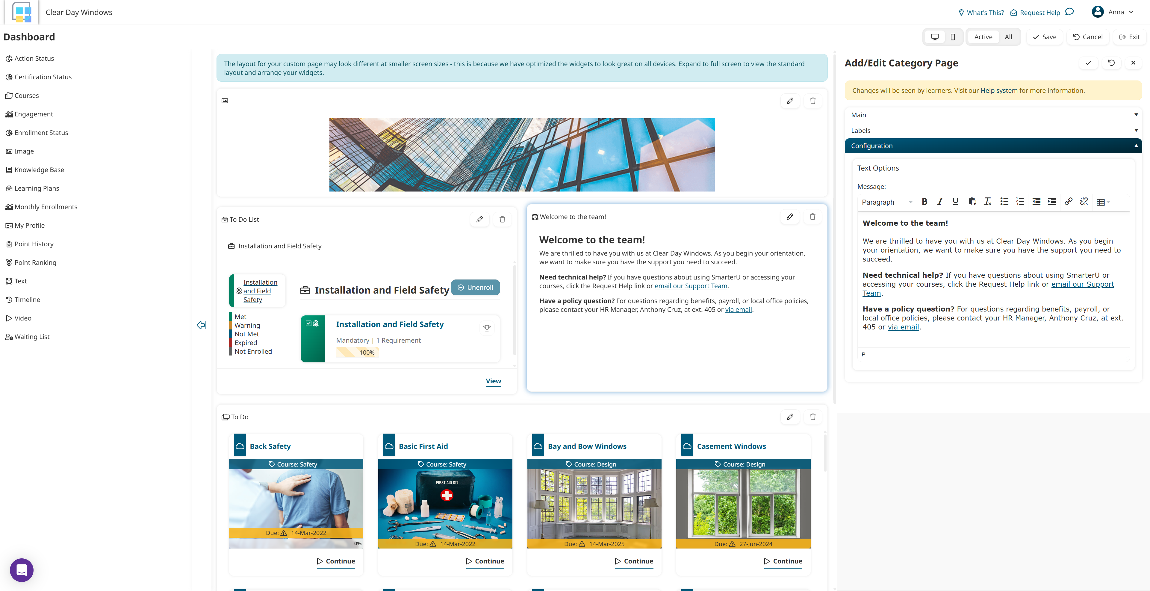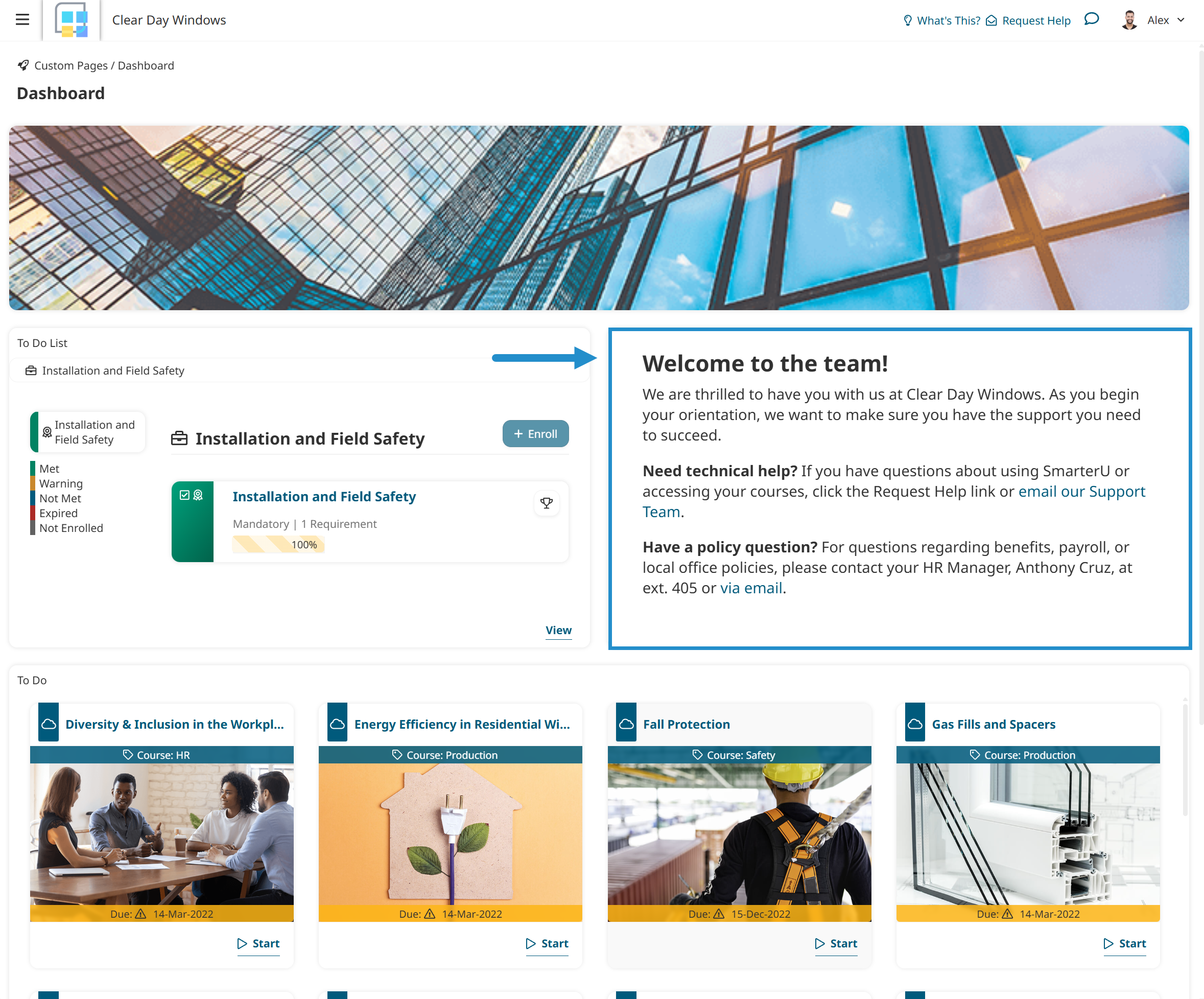 After logging in to SmarterU, Alex lands on a custom dashboard page that provides a list of courses and learning plans he needs to complete. It also includes a Text widget with contact information for the Clear Day Windows’ training team and HR department.