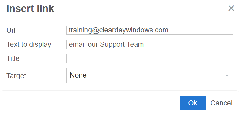 Link icon. Then, enter the email address (e.g., training@cleardaywindows.com), and click OK.