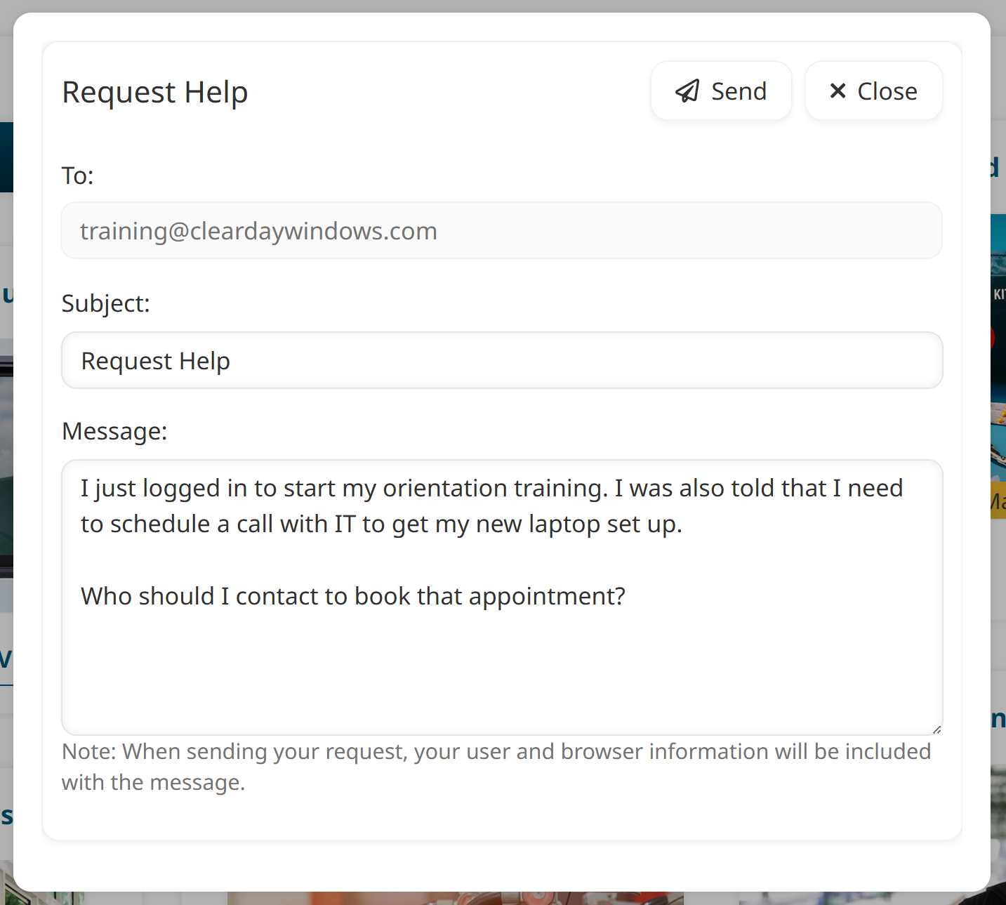 After clicking the link, Alex can simply enter his question and hit Send to contact Clear Day Windows’ general support team.