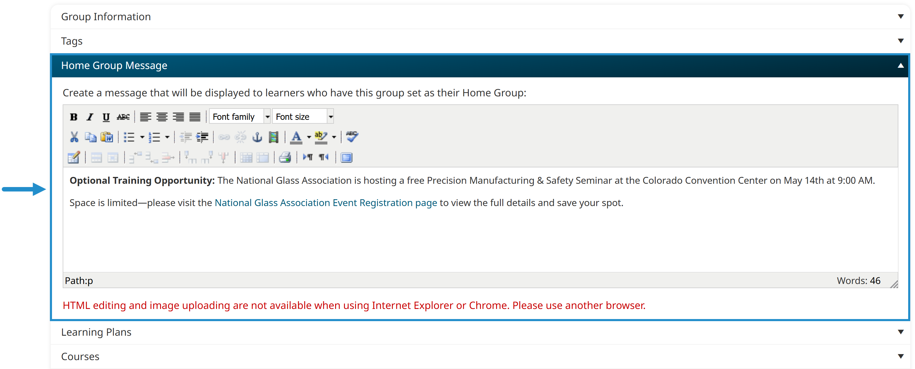 The group message banner will appear to learners until you remove or edit it.