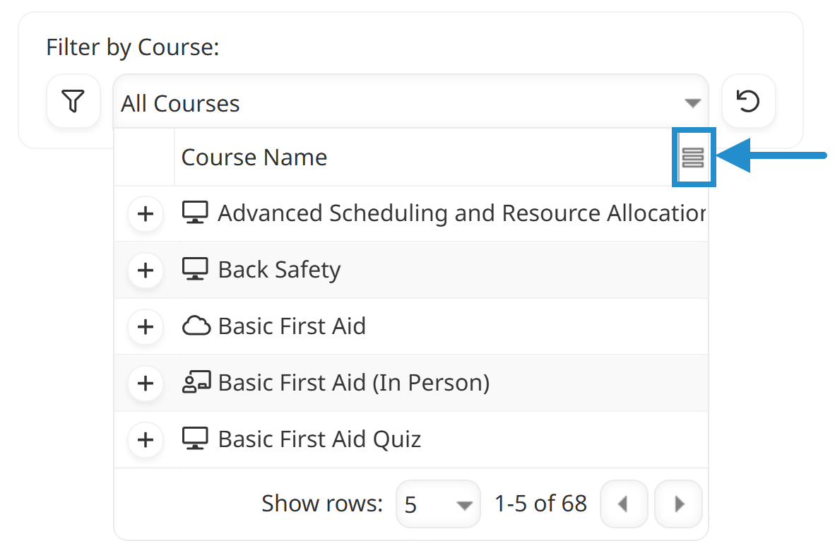 Hover over the Course Name column heading in the filter’s dropdown and click the