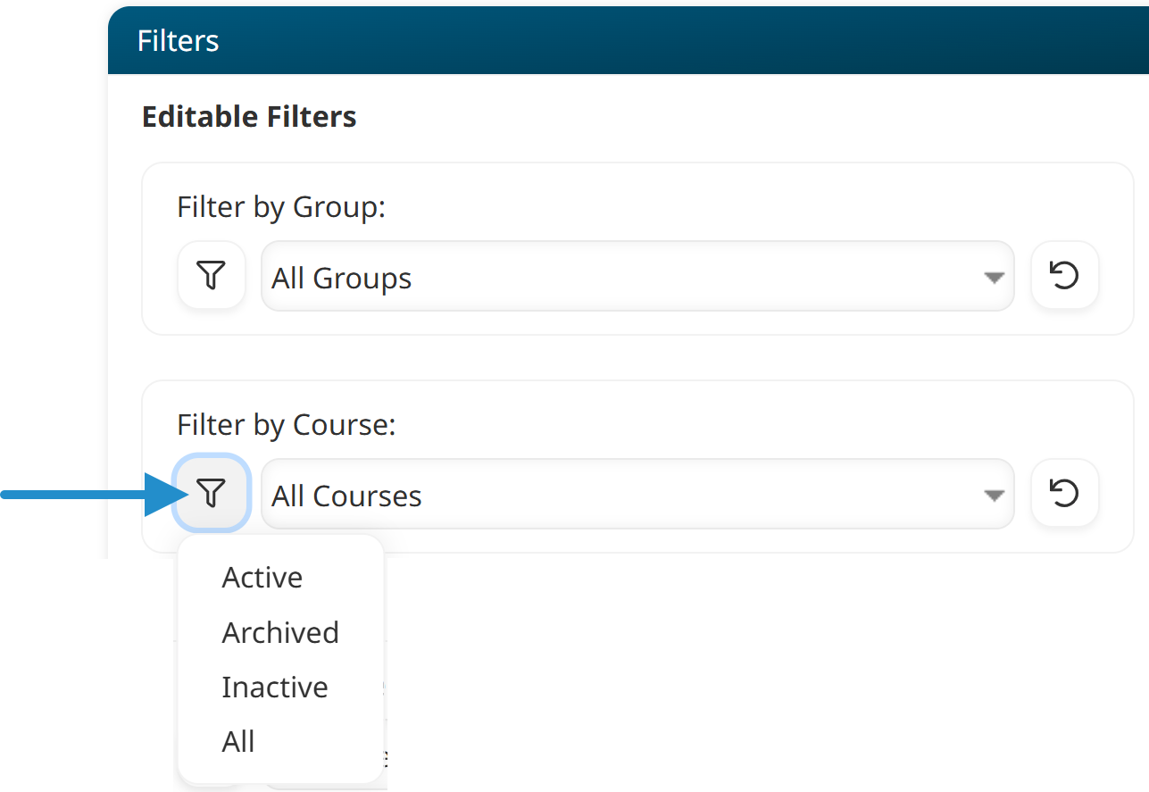 You can also filter courses by status (e.g., Active, Inactive) by clicking the