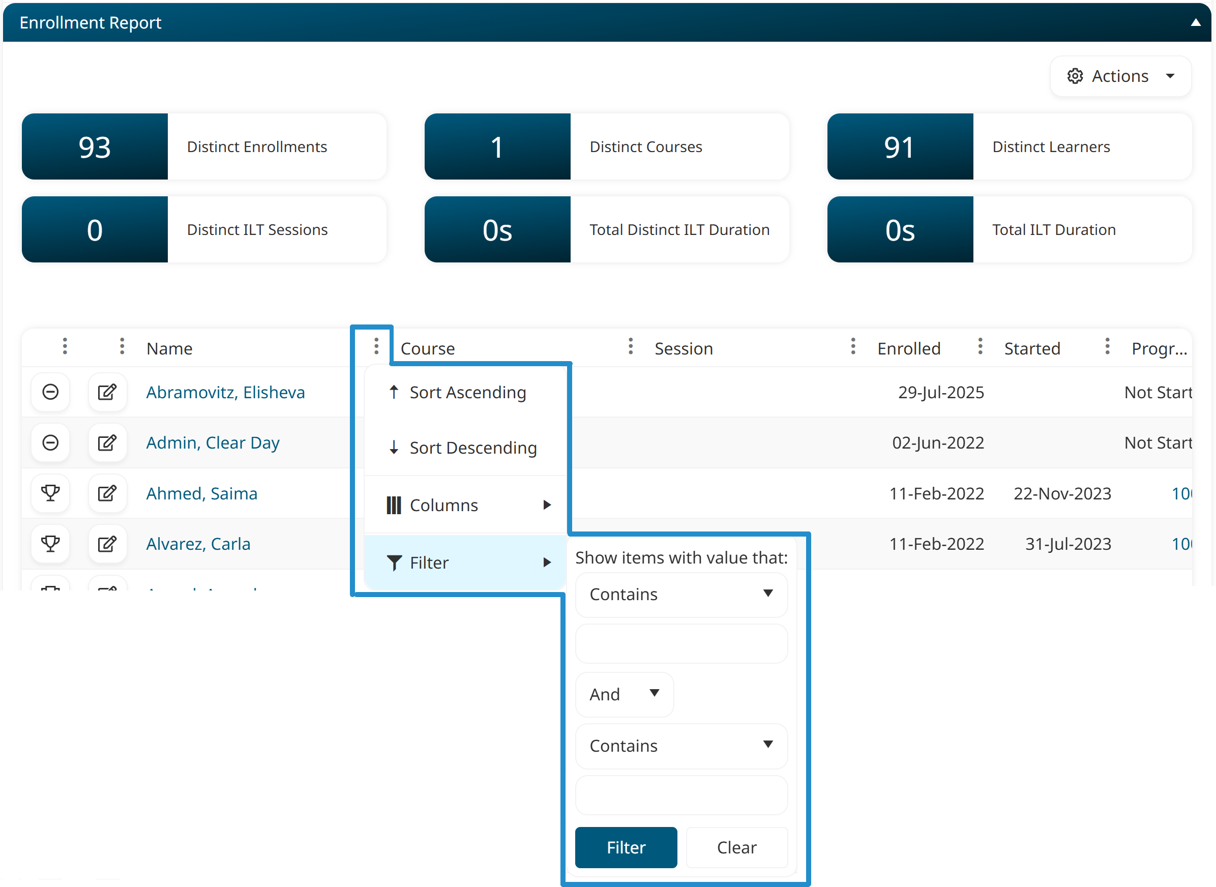 icon. For example, you can search the Name column of the Enrollment Report to find specific learners.
