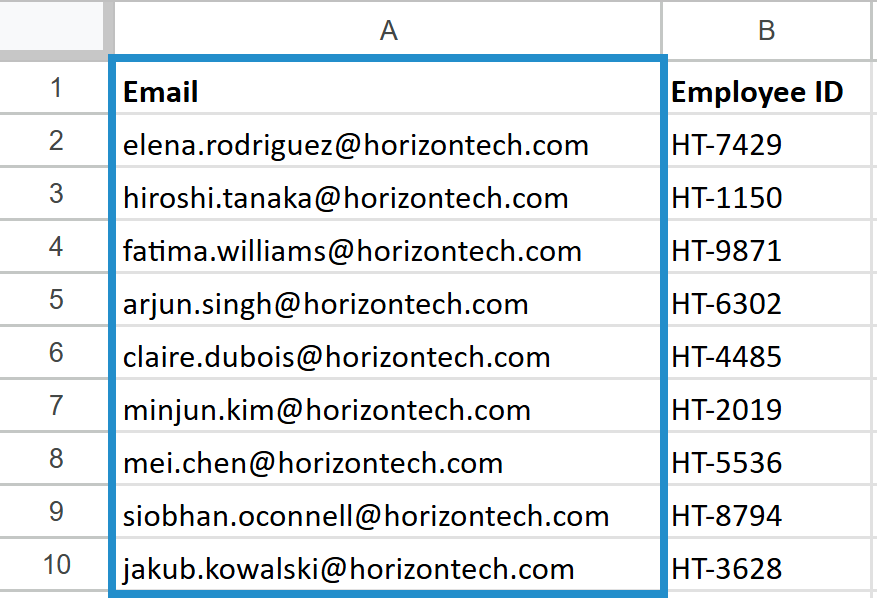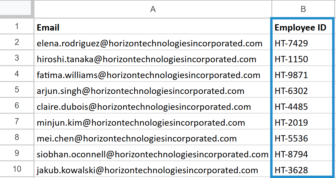 Maya, a SmarterU administrator at Horizon Tech, needs to update the email addresses of all employees after the company changed its name. Since users log into SmarterU with their email, their user profiles currently don’t include their employee IDs.
