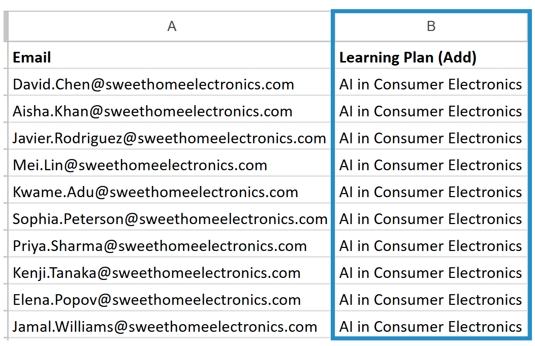 Anya, a SmarterU administrator at Sweet Home Electronics, must assign several hundred employees to the AI in Consumer Electronics learning plan. Instead of updating each user individually, she exports all of her user information from SmarterU. She edits the CSV file to remove all the columns except Email, then adds the Learning Plan (Add) column to specify the learning plan she wants to assign.